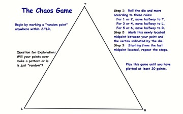 The specific activity I use to introduce chaos theory and fractals is the Chaos Game because it has such a surprising outcome (a common element in many areas of chaos theory).